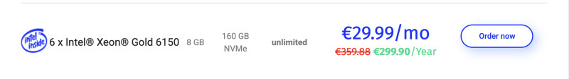 6 x Intel® Xeon® Gold 6150 CPU - 8 GB Ram - 160 GB NVMe SSD VPS costing yearly 300 euros ~ $355 ~ 0,80 XMR.