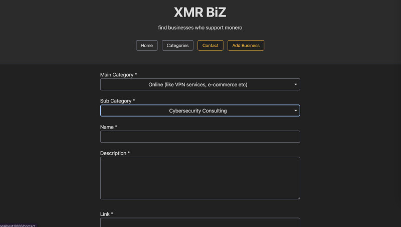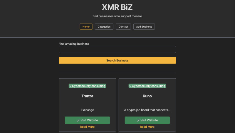 XMRBiz.com is a monero business listing website for Monero lovers. Still on development stage. On our website, we don't use any JavaScript related technology and it will be on Onion (Tor), i2p (The Invisible Internet Project) available. You can visit and check it from here: https://xmrbiz.com